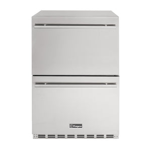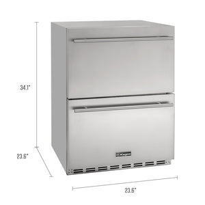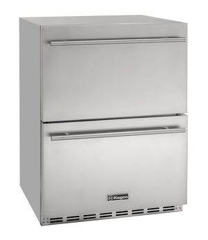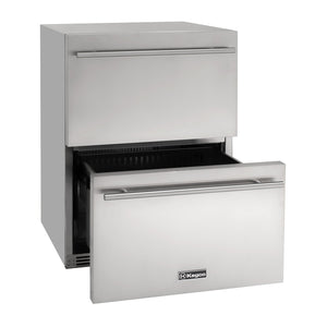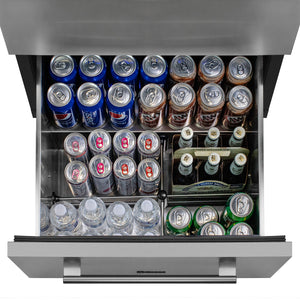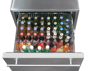 Two drawers | Top drawer can hold up to 84 cans or 54 bottles. Bottom drawer can hold up to 70 cans or 56 bottles. Capacity is based on standard 12oz. cans or 22oz. beer bottles at 11" tall.