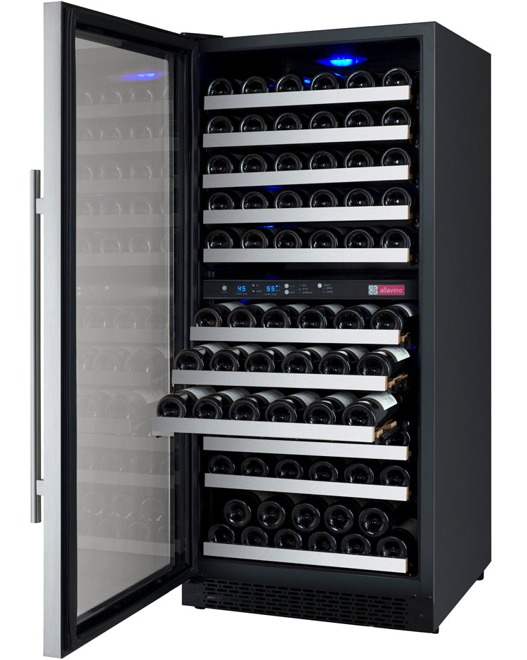 Allavino's exclusive FlexCount wine racking technology cradles bottles and is designed with vibration-reduction technology to protect aging wines. This unique shelving design allows for ultimate flexibility and versatility when it comes to storing a variety of bottle sizes and shapes. Easy gliding shelves allow for easy access to your collection without disrupting the delicate wine maturation process.