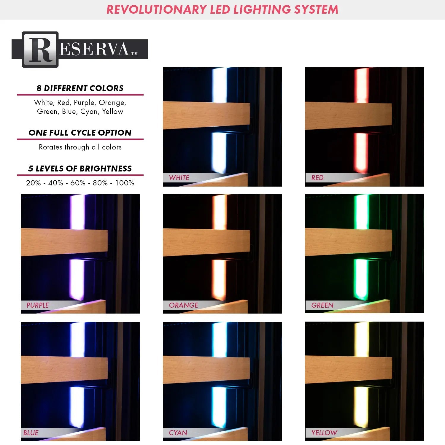 The customizable LED lighting system gives you 8 different color options + 1 full cycle option that rotates through all colors. Unlike incandescent lighting, LED lighting does not give off heat that can damage your wine.