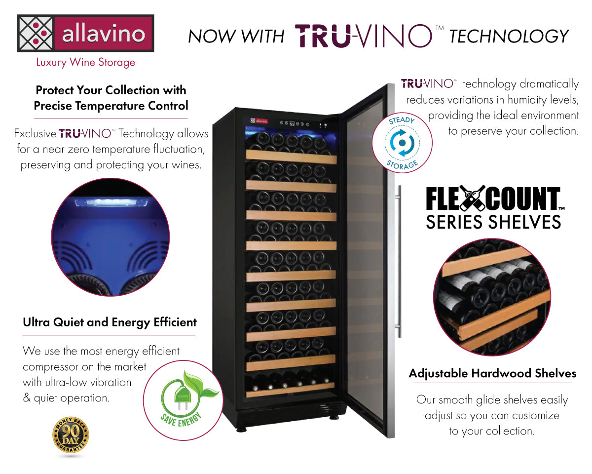 The Allavino Vite II YHWR115-1SR20 Wine Refrigerator with Tru-Vino Temperature Control Technology is a stylish freestanding unit that can hold up to 99 bottles. Protect and preserve your wine collection with the latest innovation in wine storage technology by Allavino. Easily set your desired temperature with the easy-to-use digital control panel and trust in Tru-Vino Temperature Control Technology to protect your collection through consistent temperature maintenance. This wine refrigerator features sturdy hardwood shelves that can be easily adjusted to fit the needs of your collection. The smooth gliding shelves allow for convenient access to every bottle without disrupting the delicate wine maturation process.