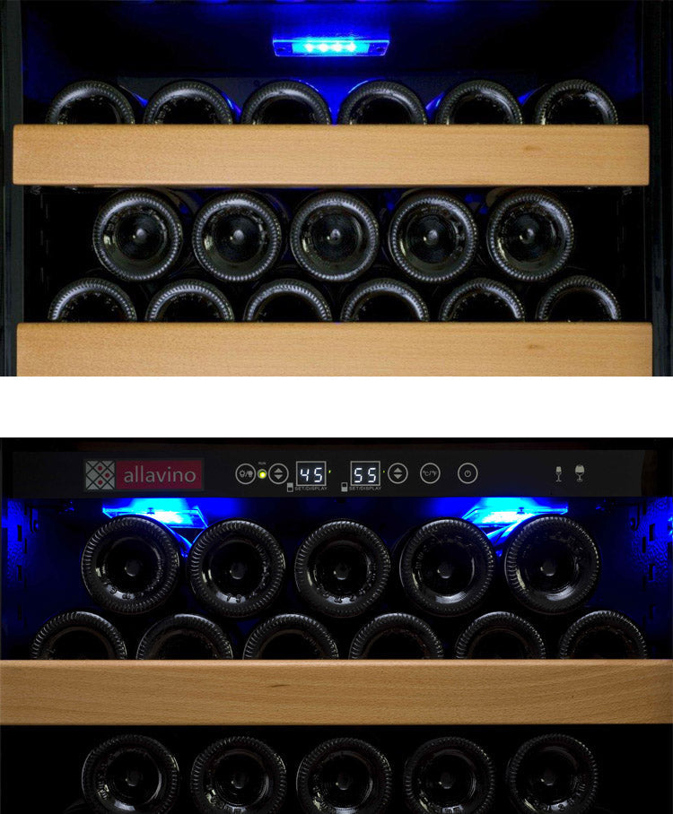 The Allavino Vite II YHWR99-2BR20 Wine Refrigerator with Tru-Vino Temperature Control Technology is a stylish freestanding unit that can hold up to 99 bottles. Protect and preserve your wine collection with the latest innovation in wine storage technology by Allavino. Easily set your desired temperature with the easy-to-use digital control panel and trust in Tru-Vino Temperature Control Technology to protect your collection through consistent temperature maintenance. This wine refrigerator features sturdy hardwood shelves that can be easily adjusted to fit the needs of your collection. The smooth gliding shelves allow for convenient access to every bottle without disrupting the delicate wine maturation process.