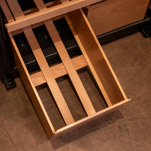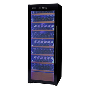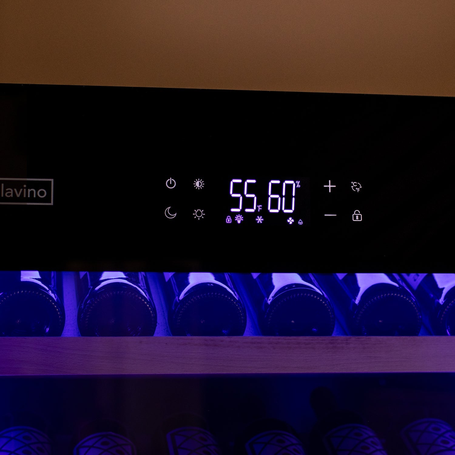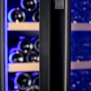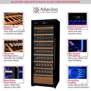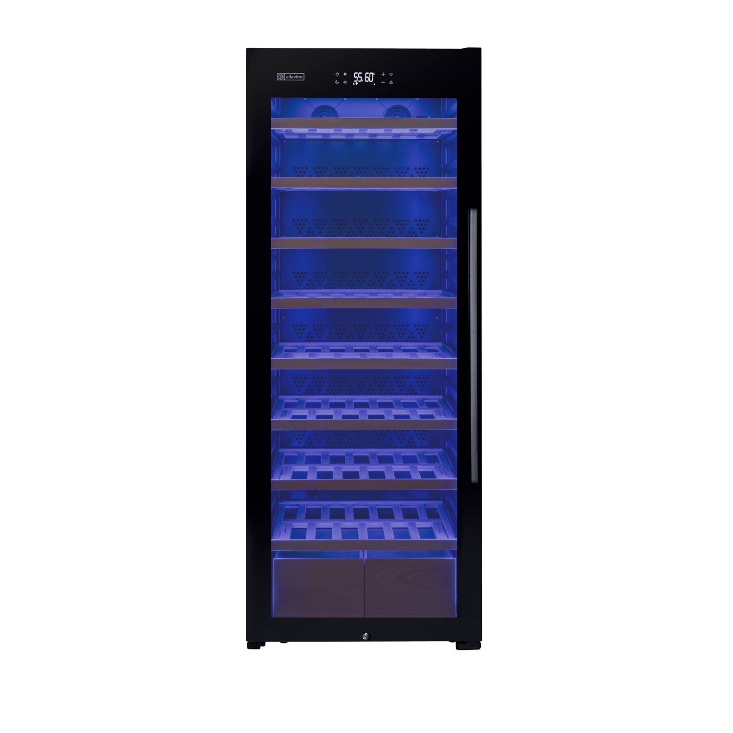 The Allavino KWR248S-1BGL Wine Refrigerator with Display Shelving is a stylish freestanding unit that can hold up to 248 bottles. The KWR248S-1BGL features touch panel digital controls with a bright LED temperature and humidity display. The wide temperature range allows you to set it low enough to store white wine at serving temperature, or high enough for long term storage of red wine, depending on the needs of your collection. The external temperature display lets you view the set temperature and humidity level without having to open the door and disturb your wine. Each of the 8 hardwood shelves can support the weight of up to 30 regular size bottles stored flat, or be converted into display shelves to show off your favorite bottles. The racks can be removed or adjusted to accommodate larger bottles, so you are not limited in the types of bottles you can store. Two drawers at the bottom of the wine refrigerator allow for additional storage. Seamless black glass frame doors showcase an elegant and clean profile while also resisting visible fingerprints, and tinted LowE glass protects your wine from the harmful effects of UV light. Cool blue light beautifully illuminates the interior, making finding the perfect bottle fast and easy. The lights emit much less heat than an incandescent bulb which means they can be left on to showcase your collection without creating a harmful hot spot that could affect your wine bottles. The brightness level can be adjusted in 20% increments.