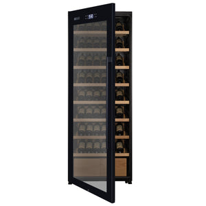 29" Wide 248 Bottle Single Zone Black Glass Left Hinge Wine Refrigerator with Display Shelving