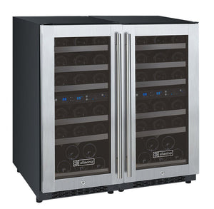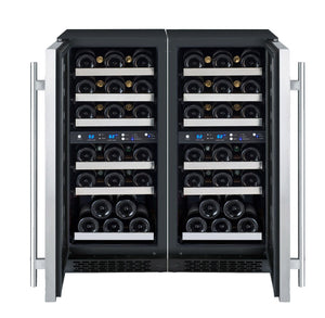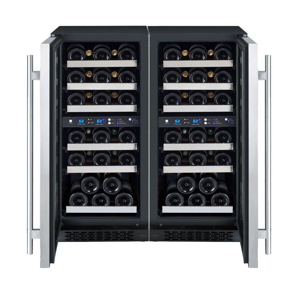 The Allavino FlexCount II Series 2X-VSWR30-2S20 Four Zone Wine Refrigerator with Tru-Vino Temperature Control Technology makes it easy to store up to 60 wine bottles of various sizes, and can be used as a stylish freestanding unit or built into your cabinetry for seamless wine storage. This unit is made up of two dual zone wine refrigerators with opposite hinges placed side by side.