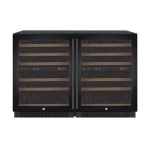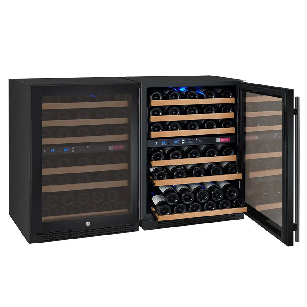 The Allavino FlexCount II 2X-VSWR56-2B20 Four Zone Wine Refrigerator with Tru-Vino Temperature Control Technology makes it easy to store up to 112 wine bottles of various sizes, and can be used as a stylish freestanding unit or built into your cabinetry for seamless wine storage. This unit is made up of two dual zone wine refrigerators with opposite hinges placed side by side.