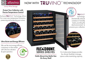Allavino's exclusive FlexCount racking technology cradles bottles and is designed with vibration-reduction technology to protect aging wines. This unique shelving design allows for ultimate flexibility and versatility when it comes to storing a variety of bottle sizes and shapes. Smooth gliding shelves allow for easy access to your collection without disrupting the delicate wine maturation process.
