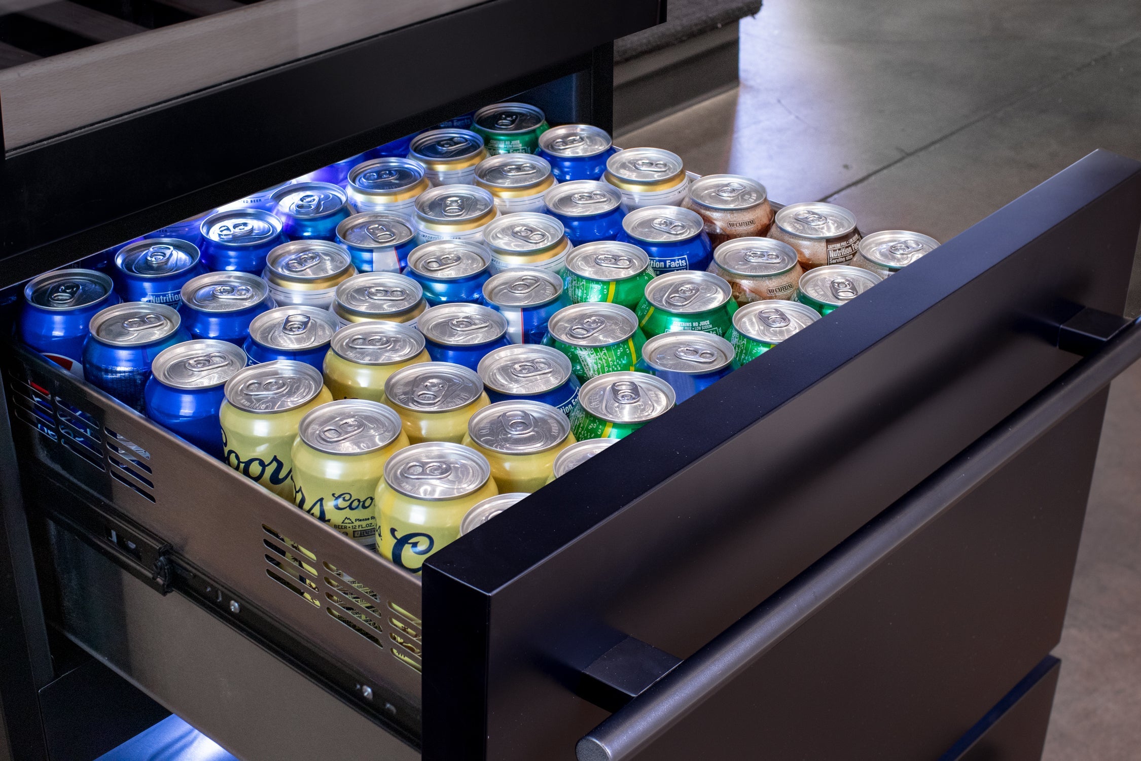 The wine cooler can hold a total of up to 108 wine bottles. The bottom of the unit has two drawers that can hold a combined total of up to 182 cans or 105 bottles. Capacity is based on standard 750ml wine bottles, 12oz. cans or 22oz. beer bottles at 11" tall and maximum count may vary.