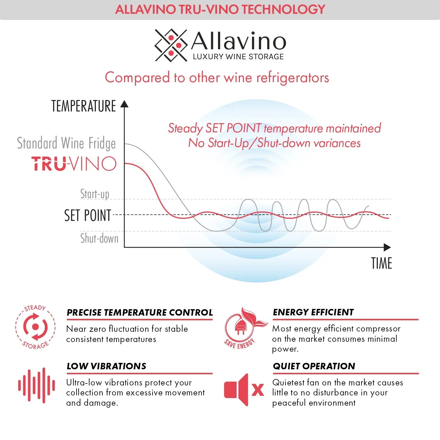 Ultra-quiet, high-quality Italian inverted compressor makes Allavino wine refrigerators the quietest units on the market. Our fans cause little to no disturbance maintaining a discreet, peaceful environment.