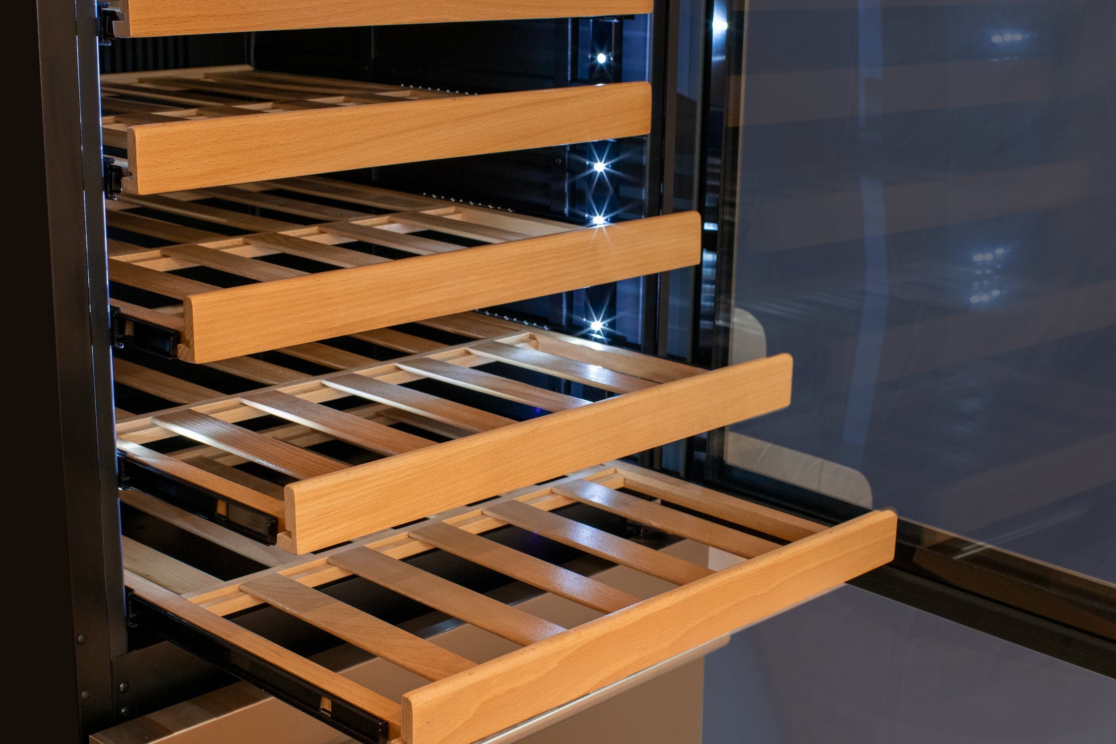 90% effortless shelf extension on smooth, heavy duty ball-bearing tracks allow easy access to your back row collection minimizing agitation to your wine. Thin metal racks with slotted venting allow thorough airflow while simultaneously preventing sagging.