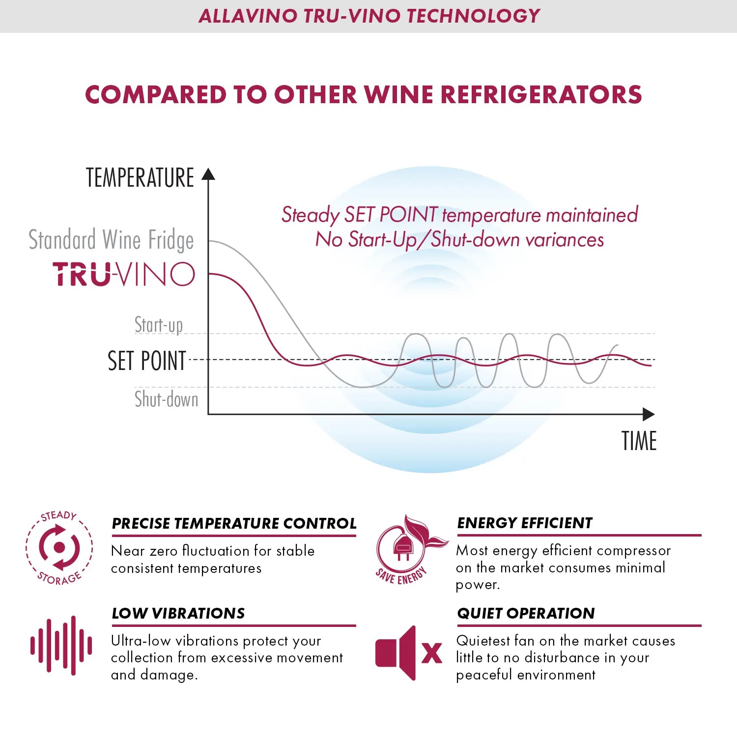 Tru-Vino Cooling Technology delivers precise temperature control with near zero fluctuations for stable consistent temperatures. Unlike other wine refrigerators, Tru-Vino compressors maintain a steady SET POINT that keep your unit from shutting off and on making it the most energy-efficient compressor on the market.