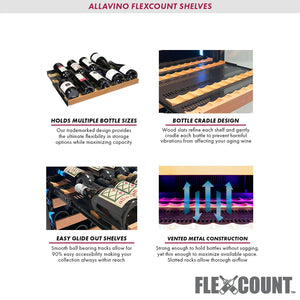 Allavino's exclusive FlexCount shelves give you ultimate flexibility and accessibility, regardless of bottle size. Spacing between each shelf gives you enough clearance to not worry about racks scraping your bottle labels. Wood slats refine each shelf to cradle your wine bottles and are designed with vibration-reduction technology to prevent harmful vibrations from excessive movement and damage.