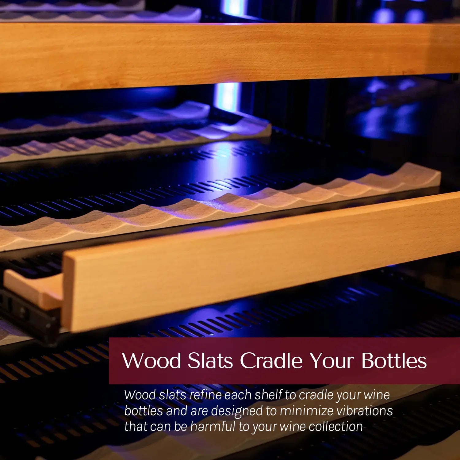 Allavino's exclusive FlexCount shelves give you ultimate flexibility and accessibility, regardless of bottle size. Spacing between each shelf gives you enough clearance to not worry about racks scraping your bottle labels. Wood slats refine each shelf to cradle your wine bottles and are designed with vibration-reduction technology to prevent harmful vibrations from excessive movement and damage.