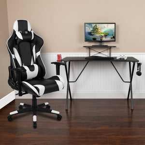Set yourself up to put on a performance at your new gaming computer desk set with racing gaming chair. This gaming desk and chair set will put you ahead of the game world with its ultra-comfortable headrest and lumbar pillows that can be adjusted or removed. With a reclining office chair that reclines 87° ~ 145° with a pull of a lever you're positioned to take down any opponent.