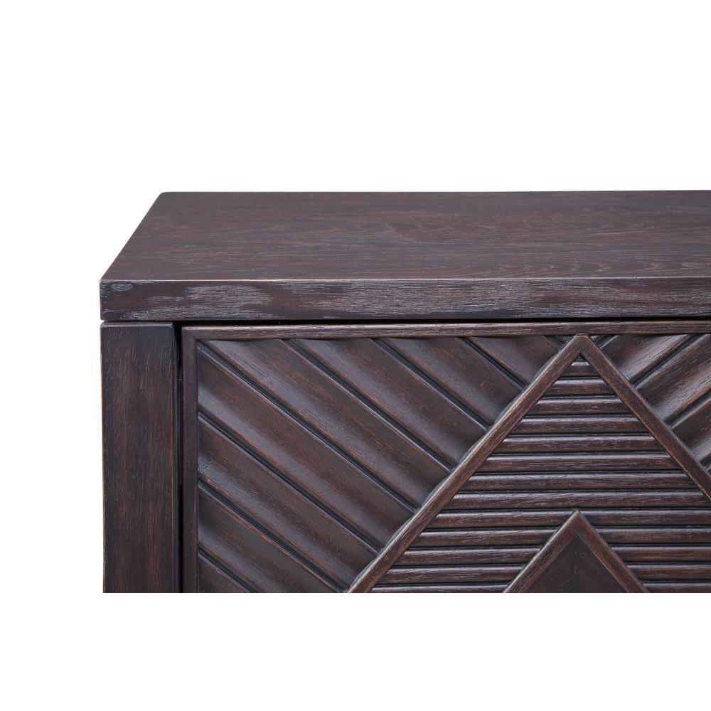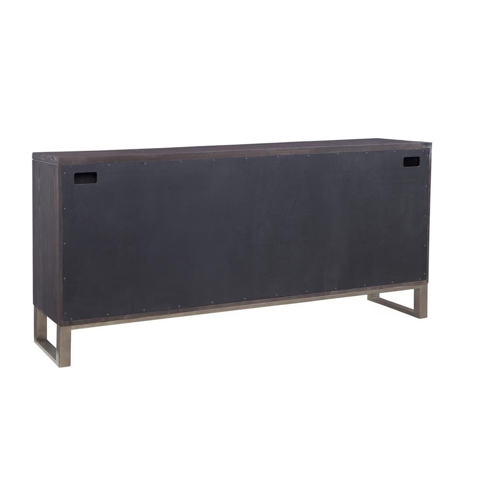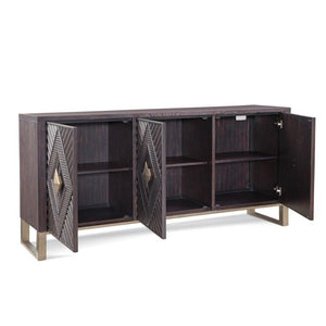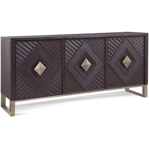 Some furniture designs simply demand your attention, and the Allamar 3-door Server clearly defines this category. Solid hardwood, three dimensional, contrasting geometric door fronts are rendered in deep, rich, ebony, and are formed around striking, oversized burnished bronze hardware that match the antiqued bronze finished base. Select oak veneers adorn the top, sides, and even the interior of the case that features adjustable shelving, and deluxe hinges.