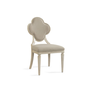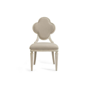 Some chairs are just drop-dead gorgeous! Such is the case with the elegant Chloe Side chair. Constructed of solid hardwood, a plush, stain resistant polyester fabric, and premium high density foam, the Claire delivers high quality craftsmanship for many years of use. The seat and back are welted to give a tailored appearance. The wood is finished in antiqued off white and features edging along the seat apron, handsome kent end front legs, and a perfectly on-trend quatrefoil shaped chairback.