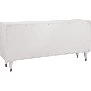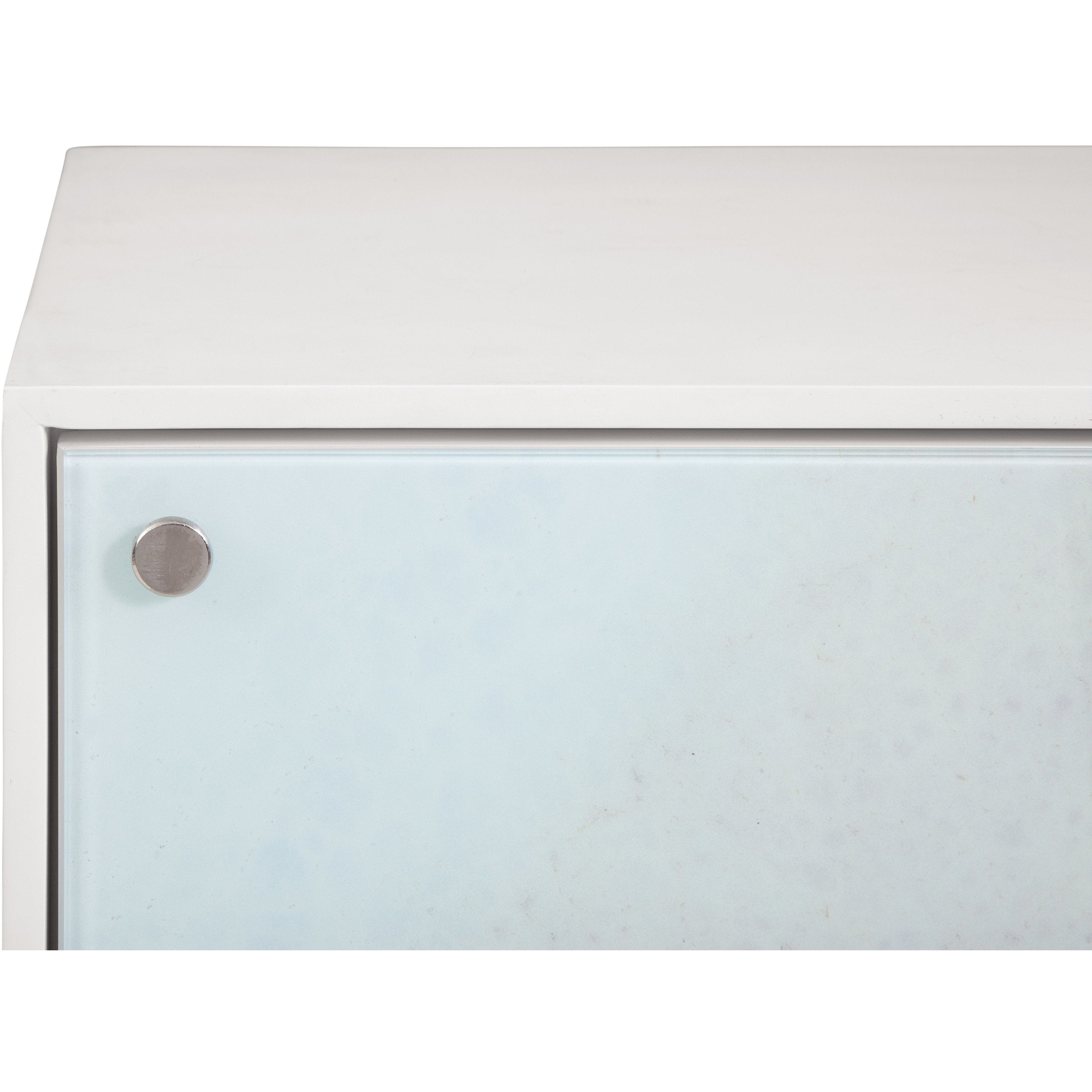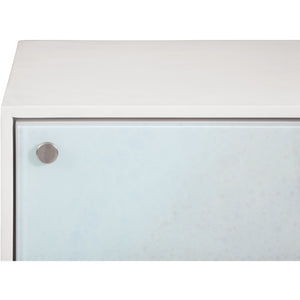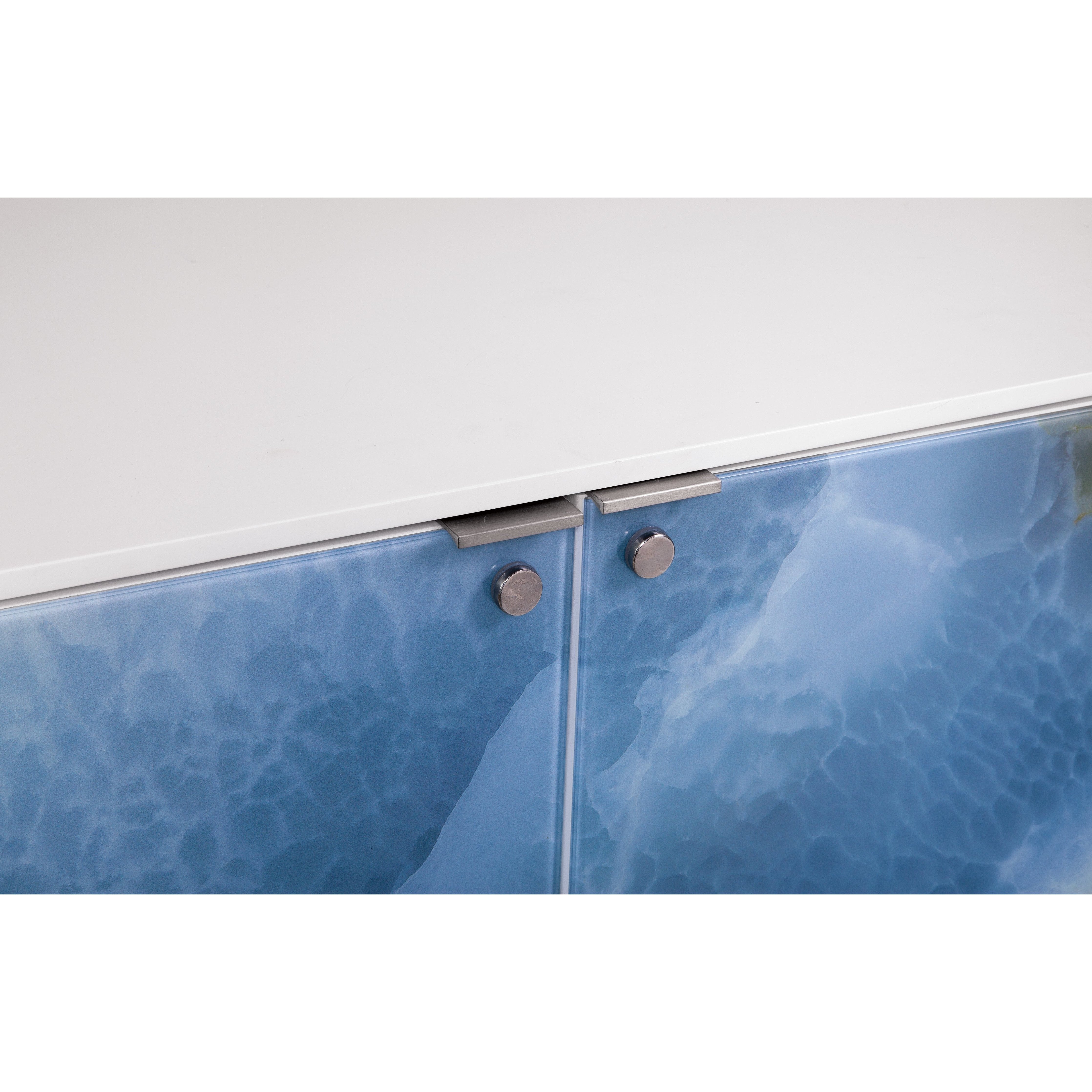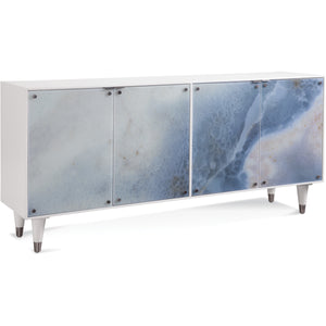 Modern furniture provides the best opportunity to utilize new materials and technologies to create innovative, exclusive designs. The Clayton Server uses advanced printing techniques to form the door fronts that show a high resolution polished mineral image that is printed onto a glass panel. The glass panel sandwiches the image between the wood door face and glass, thus protecting it from surface degradation. The case is finished elegant arctic white lacquer, and features premium no-visible-hinge hardware, press and release door opening system, adjustable shelving, and tapered legs with brushed nickel ferrules.