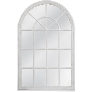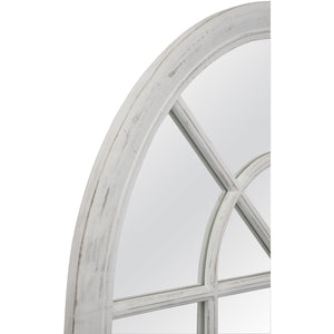 The Lidle Leaner mirror in distressed white is a beautiful farmhouse window pane reflection.