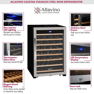 If you're a wine lover with limited available storage space and an ever-expanding bottle count, the Allavino Cascina Series KWR55S-1SR Wine Refrigerator is just what you've been looking for! You can store up to 55 bottles in this elegant freestanding compact cellar with ultramodern performance features that treat your collection with the care it deserves. The KWR55S-1SR has 5 shelves that can hold 8 bottles each and 3 shelves that can store 5 bottles each. These sturdy wooden shelves can be effortlessly extended or taken out for easy loading and unloading. An easy to read LED display is conveniently mounted on the upper outside section of the stainless steel framed glass door, allowing you to easily monitor and adjust your temperature without having to open the door. The temperature can be set as low as 41°F or as high as 64°F depending on your needs. Showcase your collection and ensure that you can always find the bottle you're looking for with cool blue LED lighting, which can illuminate your cabinet with the push of a button. Keep harmful light away from your wine with this UV-protected tinted glass door. It is framed with sleek stainless steel, and features a keyed security lock to further protect your bottles.