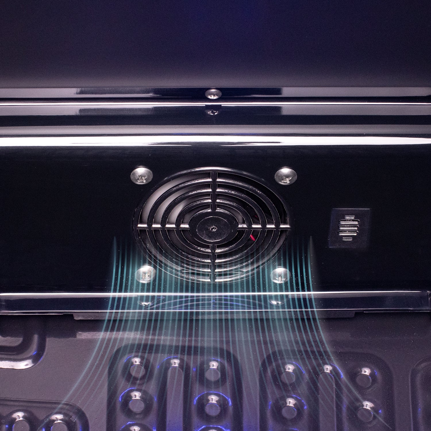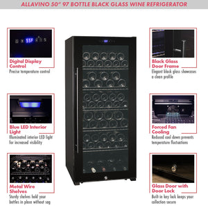 The Allavino KWR102S-1BGR Contemporary Wine Refrigerator is a stylish freestanding unit that can hold up to 102 bottles. It features digital touchscreen controls with a bright LED temperature display. The wide temperature range allows you to set it low enough to store white wine at serving temperature, or high enough for long term storage of red wine, depending on the needs of your collection. The external temperature display lets you view the set temperature without having to open the door and disturb your wine. Each of the 5 wire shelves can support the weight of up to 16 regular size bottles stored flat, with additional space in the top and bottom. The racks can be removed or adjusted to accommodate larger bottles, so you are not limited in the types of bottles you can store. Seamless black glass frame doors showcase an elegant and clean profile while also resisting visible fingerprints, and tinted LowE glass protects your wine from the harmful effects of UV light. Cool blue light beautifully illuminates the interior, making finding the perfect bottle fast and easy. The lights emit much less heat than an incandescent bulb which means they can be left on to showcase your collection without creating a harmful hot spot that could affect your wine bottles. The brightness level can be adjusted in 20% increments.