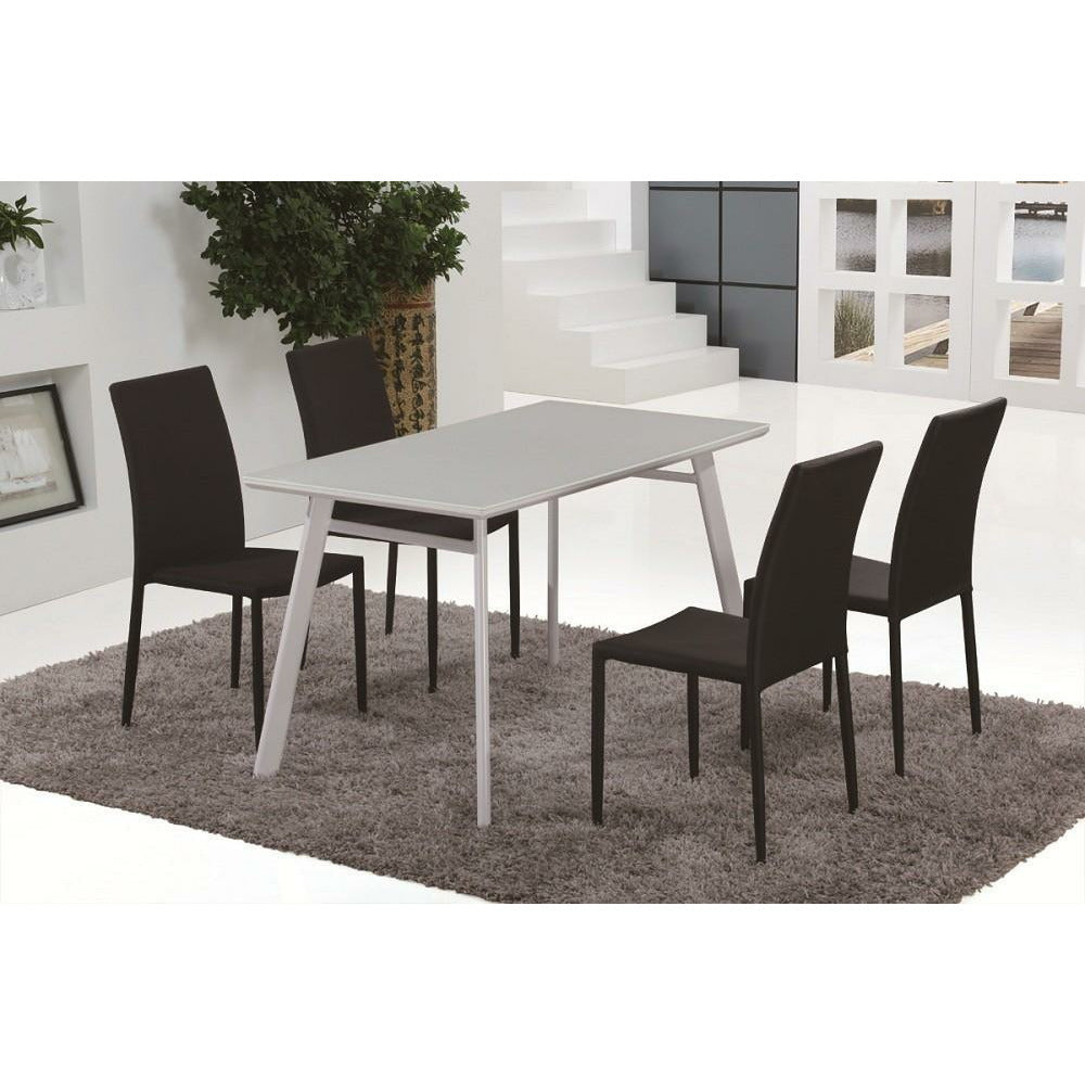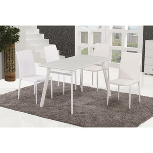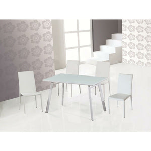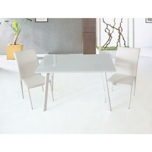 Rectangular dining table with a glass top and white chrome legs in a white lacquer finish. This dining table will look great in any dining room or kitchen.