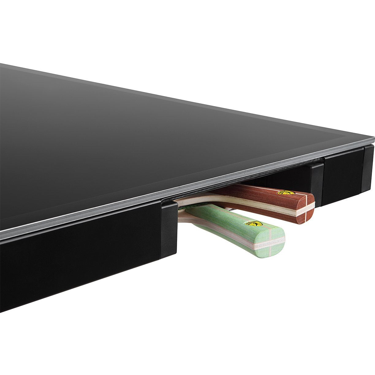 Stop chasing balls around the room. Store up to 8 ping pong balls and 1 paddle in each end of the MyT10 BlackStorm ping pong table. These revolutionary Killerspin storage pockets are built right into the table frame. Pockets for ping pong balls and rackets are located in each end of the table to allow easy access to your table tennis equipment. Storage has never been easier.