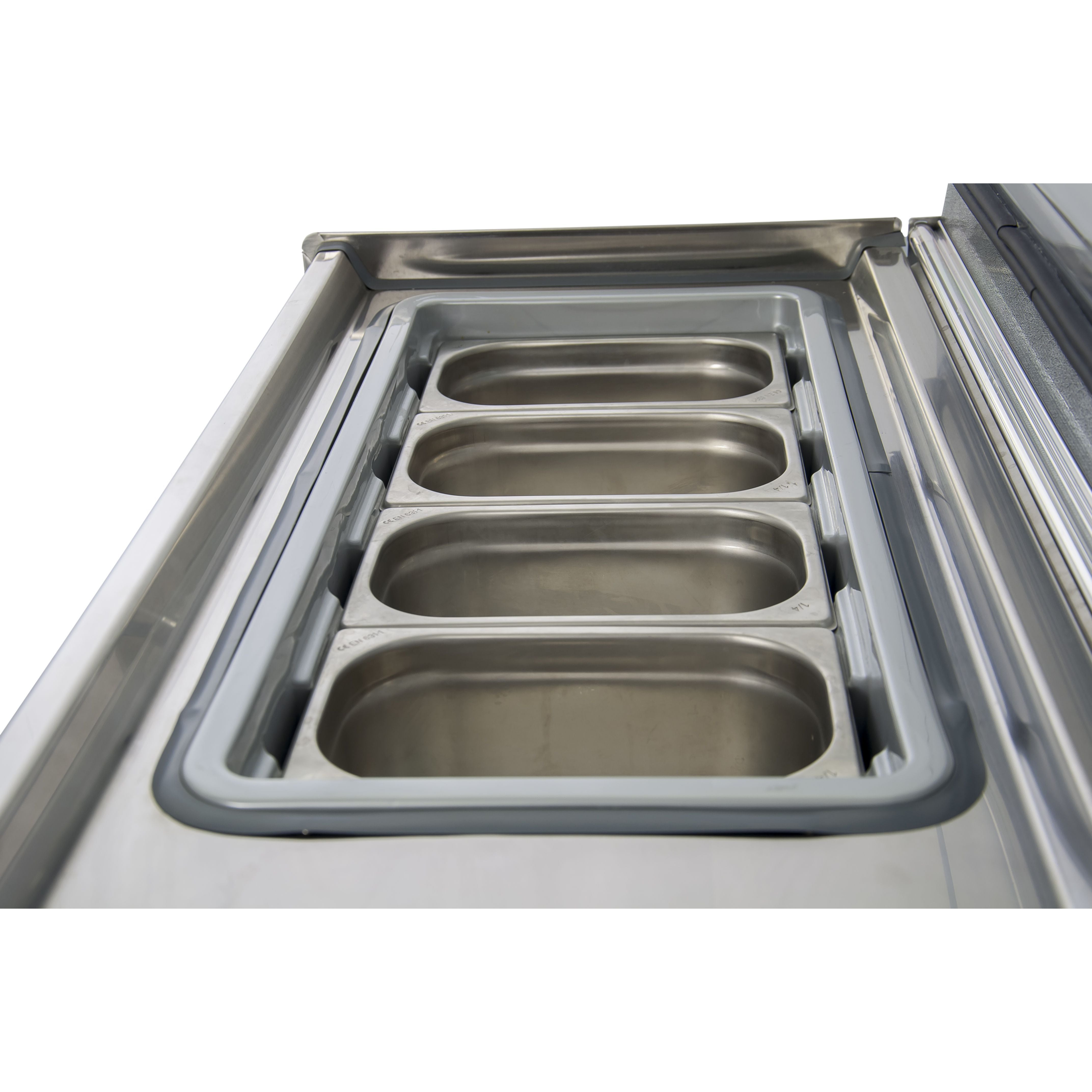 - Storage area: 4 X 2.75 qtr., 2.5L stainless steel pans