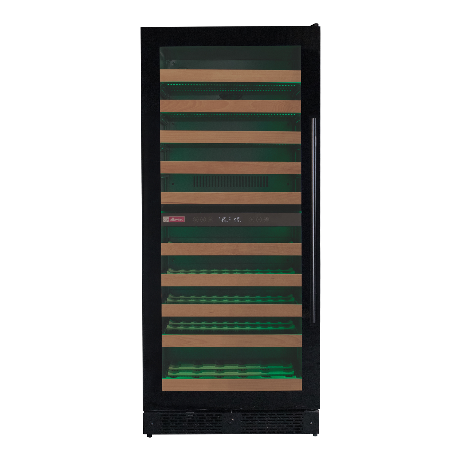 The Allavino Reserva Series VSW11955D-2BGL Dual Zone Wine Refrigerator with Tru-Vino Temperature Control Technology makes it easy to store up to 119 wine bottles of various sizes. and can be used as a stylish freestanding unit or built into your cabinetry. The seamless black glass door showcases an elegant and clean profile while also resisting visible fingerprints, and customizable LED lighting allows you to choose from 9 color options and 5 brightness levels. Unlike incandescent lighting, LED lighting does not give off heat that can damage your wine. Protect and preserve your wine collection with the latest innovation in wine storage technology by Allavino. Precisely set your desired temperature with the easy-to-use digital control panel and trust in Tru-Vino Temperature Control Technology to protect your collection through consistent temperature maintenance. Allavino's exclusive FlexCount wine racking technology cradles bottles and is designed with vibration-reduction technology to protect aging wines. This unique shelving design allows for ultimate flexibility and versatility when it comes to storing a variety of bottle sizes and shapes. Easy gliding shelves allow for easy access to your collection without disrupting the delicate wine maturation process.