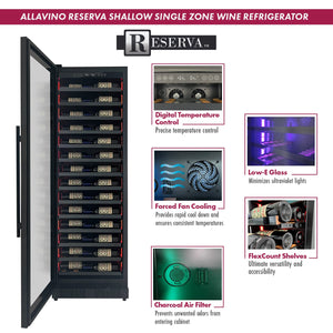 Allavino's 2X-VSW6771S-1B Reserva Series 71" Tall Dual Zone Black Side-by-Side Shallow Wine Refrigerator Console with Tru-Vino Temperature Control Technology is made up of two separate single zone wine refrigerators placed side by side. It gives you flexible storage options for a diverse collection of up to 134 wine bottles.
