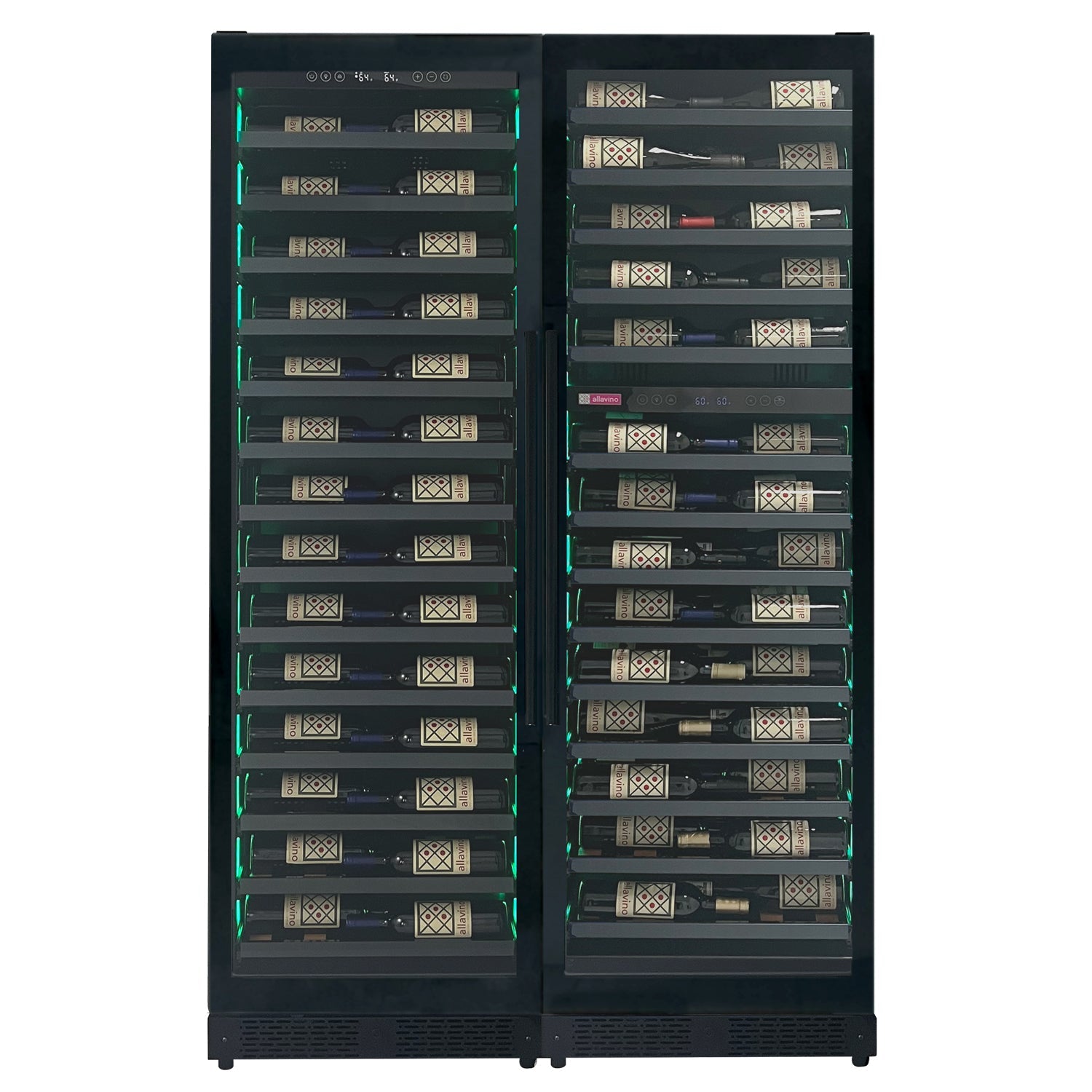 Allavino's 3Z-VSW6771 Reserva Series 71" Tall Three Zone Black Side-by-Side Shallow Wine Refrigerator Console with Tru-Vino Temperature Control Technology is made up of one single zone wine refrigerator and one dual zone wine refrigerator placed side by side. It gives you flexible storage options for a diverse collection of up to 134 wine bottles.