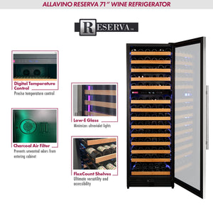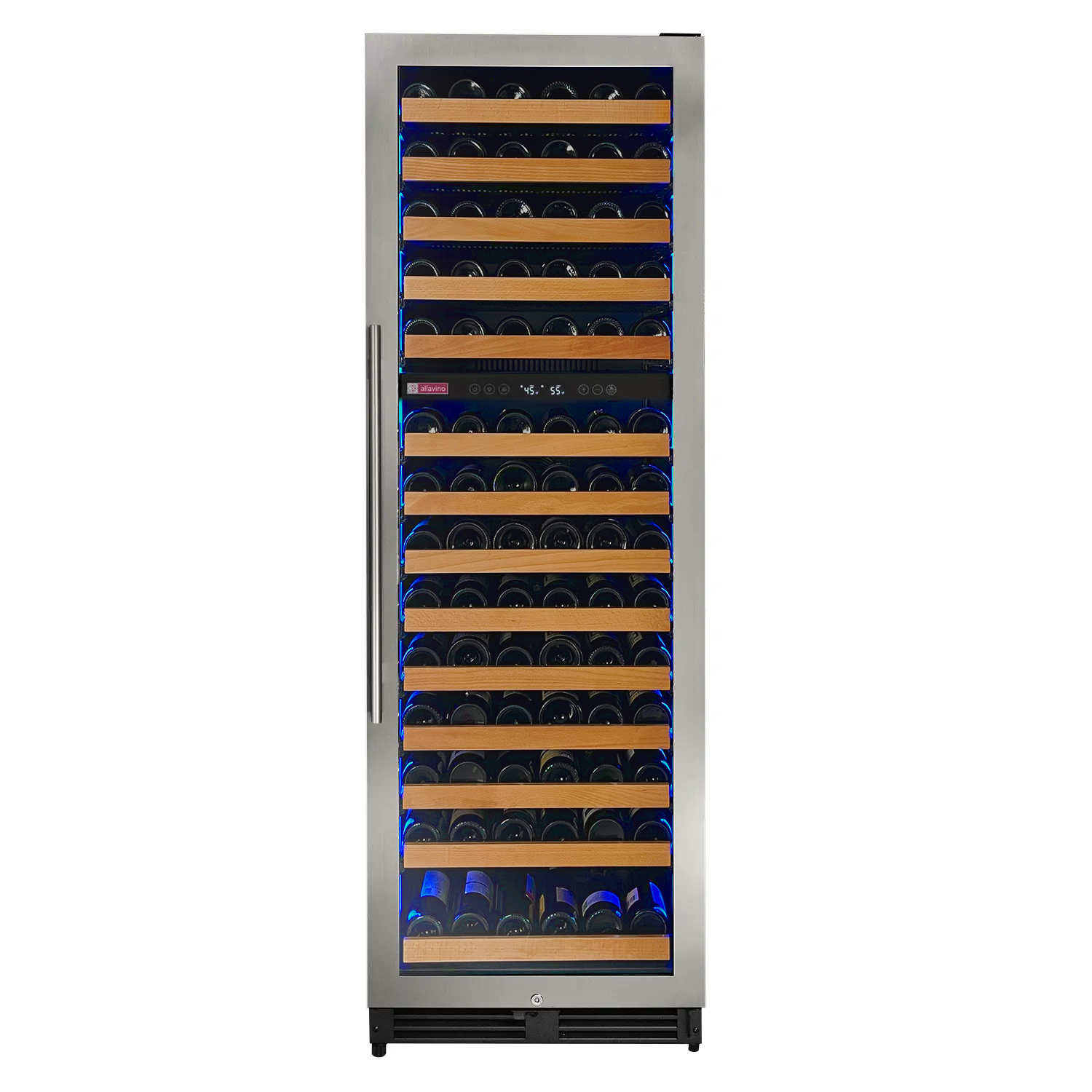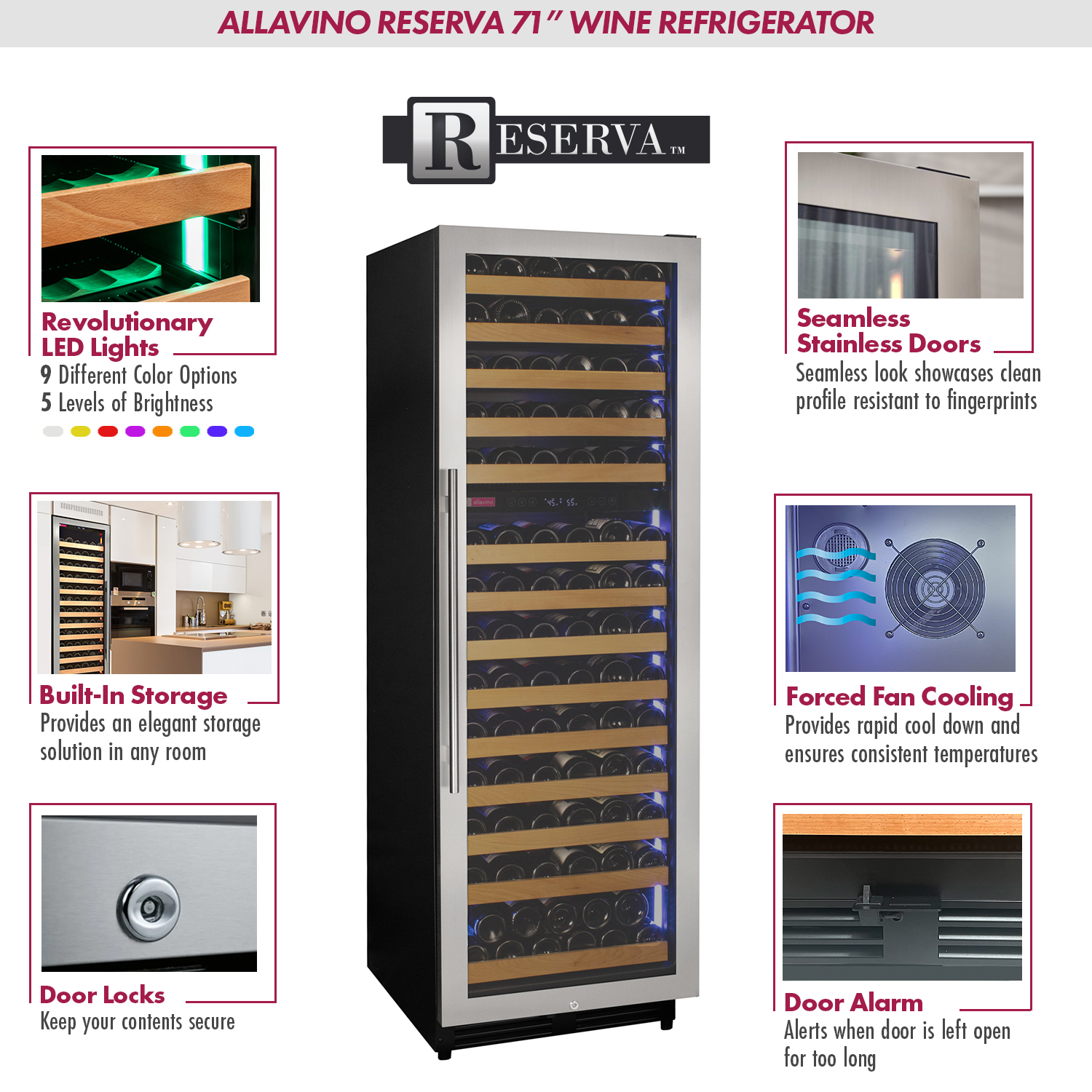 Allavino's VSW15471D-2SR Reserva Series 154 Bottle 71" Tall Dual Zone Right Hinge Stainless Steel Wine Refrigerator with Tru-Vino Temperature Control Technology features two independently controlled temperature zones that allow you to store both red and white wines at different temperatures. It gives you flexible storage options for a diverse collection of up to 154 wine bottles.