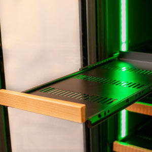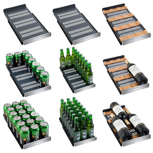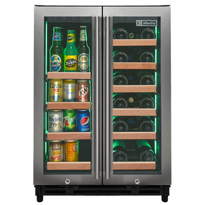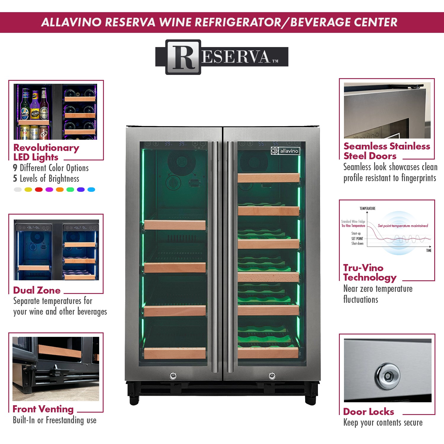 Allavino's Reserva Series 24" Wide VSBCW34FD-2SW Wine Refrigerator/Beverage Center with Tru-Vino Temperature Control Technology features two separate, independently controlled storage zones that allow you to store your wine and other beverages at different temperatures. The beverage center side has flat metal shelves for storing beverage bottles and cans, while the wine refrigerator side features wood slats that cradle your bottles for added protection. The seamless stainless steel doors showcase an elegant and clean profile while also resisting visible fingerprints. The tinted LowE glass protects your wine from the harmful effects of UV light. The customizable LED lighting allows you to choose from 9 color options and 5 brightness levels. Unlike incandescent lighting, LED lighting does not give off heat that can damage your wine. A digital control panel allows you to precisely set the temperature in each zone independently, between 39-64 degrees Fahrenheit on the beverage center side and between 41-64 degrees Fahrenheit on the wine refrigerator side. Energy efficient Tru-Vino Cooling Technology delivers precise temperature control with low vibrations and ultra-quiet operation. Allavino's trademarked design provides the ultimate flexibility in storage options while maximizing capacity. It gives you flexible storage options for up to 18 wine bottles, and up to 66 cans or 48 cans and 21 bottles.