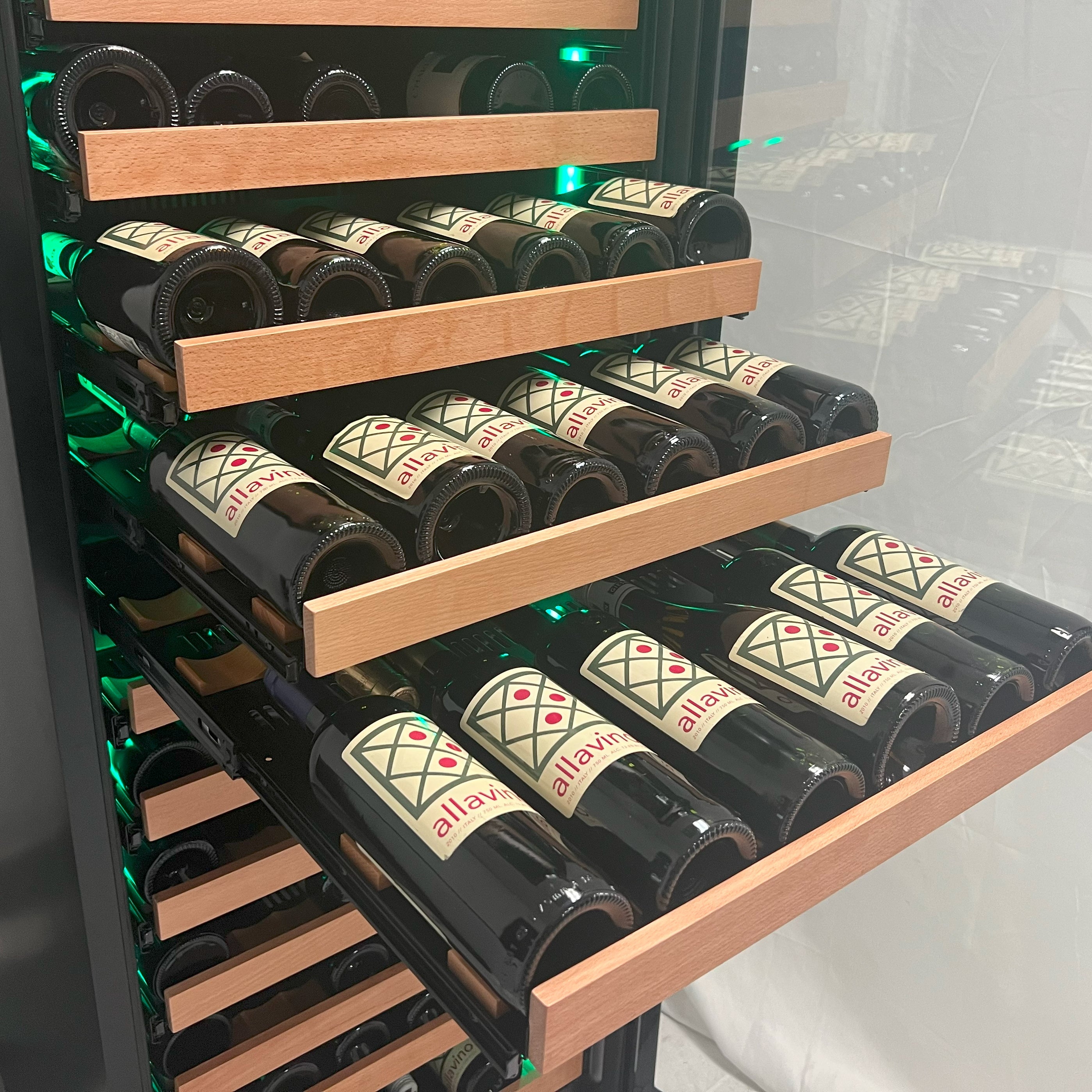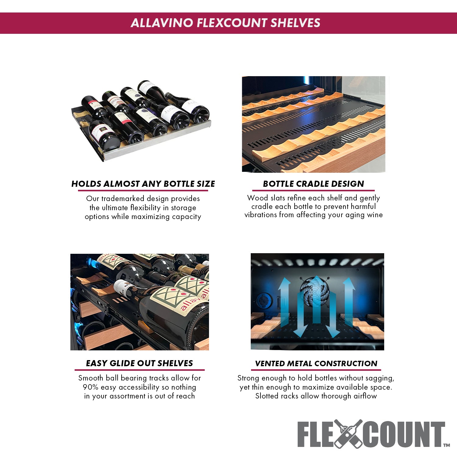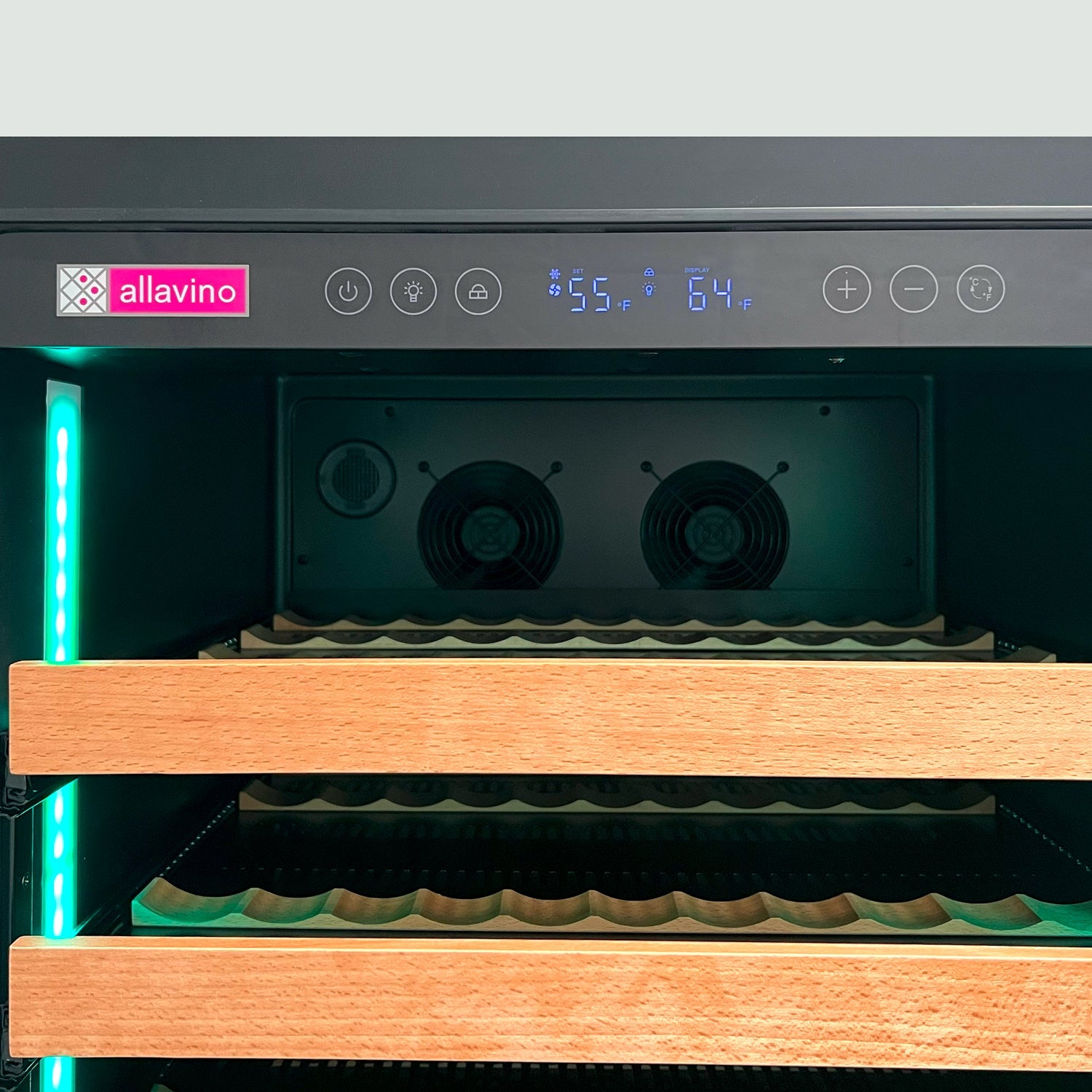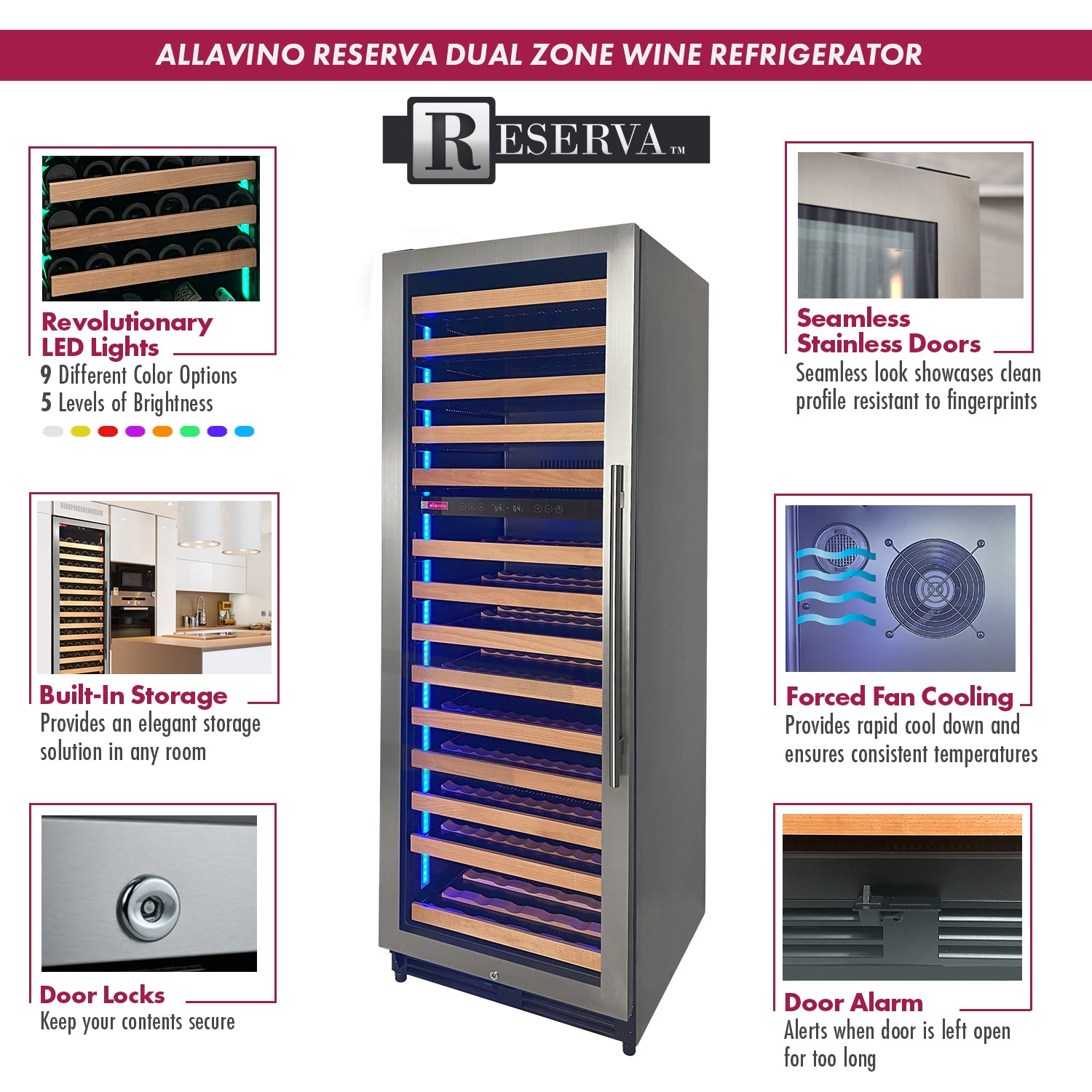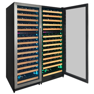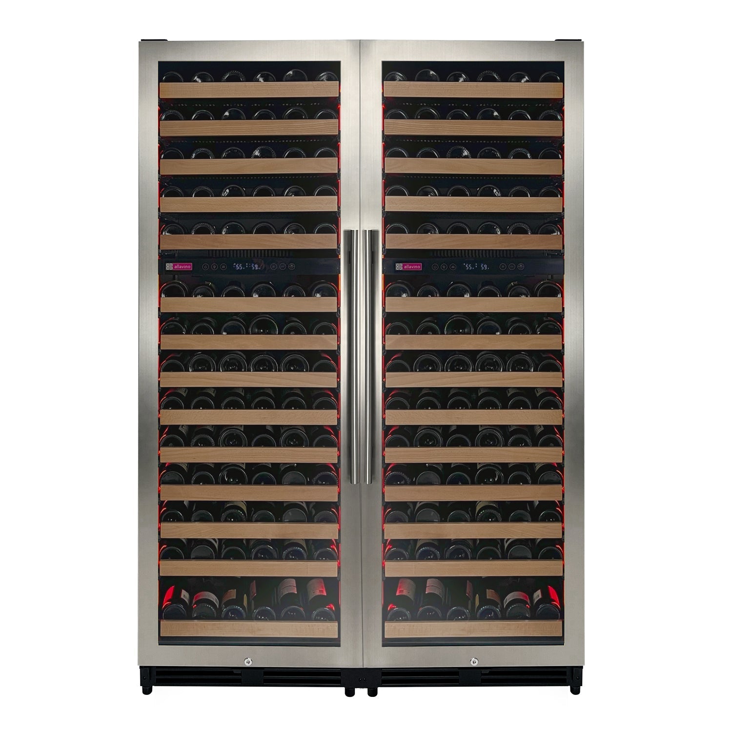 Allavino's 2X-VSW15471D-2S Reserva Series 308 Bottle 71" Tall Four Zone Stainless Steel Side-by-Side Wine Refrigerator with Tru-Vino Temperature Control Technology is made up of two separate dual zone wine refrigerators placed side by side. The wine storage racks feature wood slats that cradle your bottles for added protection. The seamless stainless steel doors showcase an elegant and clean profile while also resisting visible fingerprints, and the tinted LowE glass protects your wine from the harmful effects of UV light. The customizable LED lighting allows you to choose from 9 color options and 5 brightness levels. Unlike incandescent lighting, LED lighting does not give off heat that can damage your wine. Two digital control panels allow you to precisely set the temperature in each zone independently, between 41-64 degrees Fahrenheit. Energy efficient Tru-Vino Cooling Technology delivers precise temperature control with low vibrations and ultra-quiet operation. Allavino's trademarked FlexCount shelving design provides the ultimate flexibility in storage options while maximizing capacity. It gives you flexible storage options for a diverse collection of up to 308 wine bottles.