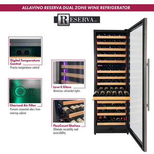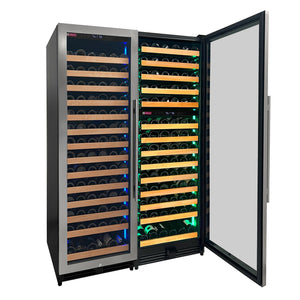 Allavino's 3Z-VSW15471 Reserva Series 317 Bottle 71" Tall Three Zone Stainless Steel Side-by-Side Wine Refrigerator with Tru-Vino Temperature Control Technology is made up one single zone wine refrigerator and one dual zone wine refrigerator placed side by side. The seamless stainless steel doors showcase an elegant and clean profile while also resisting visible fingerprints. The tinted LowE glass protects your wine from the harmful effects of UV light. The customizable LED lighting allows you to choose from 9 color options and 5 brightness levels. Unlike incandescent lighting, LED lighting does not give off heat that can damage your wine. Two digital control panels allow you to precisely set the temperature in each zone between 41 and 64 degrees Fahrenheit to store your wines at their ideal temperature. Energy efficient Tru-Vino Cooling Technology delivers precise temperature control with low vibrations and ultra-quiet operation. Allavino's trademarked FlexCount shelving design provides the ultimate flexibility in storage options while maximizing capacity. It gives you flexible storage options for up to 317 wine bottles.