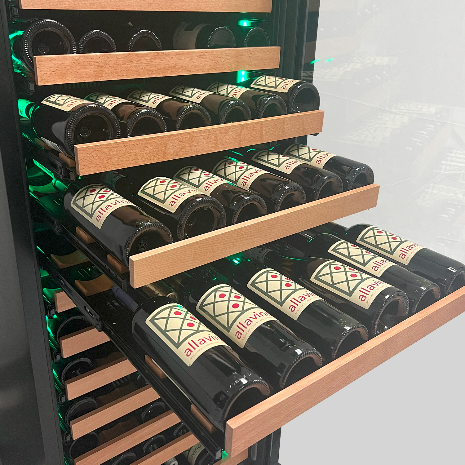 Allavino Reserva Series 2X-VSW16371S-1BG wine refrigerator stylishly stores your wine, thanks to the seamless stainless steel doors and customizable LED lighting Digital control panels allow you to precisely set the temperature between 41 and 64 degrees Fahrenheit on each side. Reserva uses FlexCount shelving design gives you flexible storage options for up to 326 wine bottles. Energy efficient Tru-Vino Cooling Technology delivers precise temperature control with low vibrations and ultra-quiet operation. Designed for both built-in and freestanding use.
