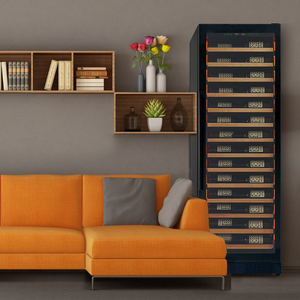 The VSW6771S-1BR-WD stores up to 67 standard bottles behind an attractive black metal door. The specially-coated glass blocks damaging UV rays from affecting your wine while allowing the bottles inside to be clearly seen on their wood-front shelves. The lighting inside is customizable, able to be switched to one of 7 colors or set to cycle through all. Store any type of wine at their preferred temperature, and the Tru-Vino technology inside will hold the temperature steady at your chosen thermostat setting.
